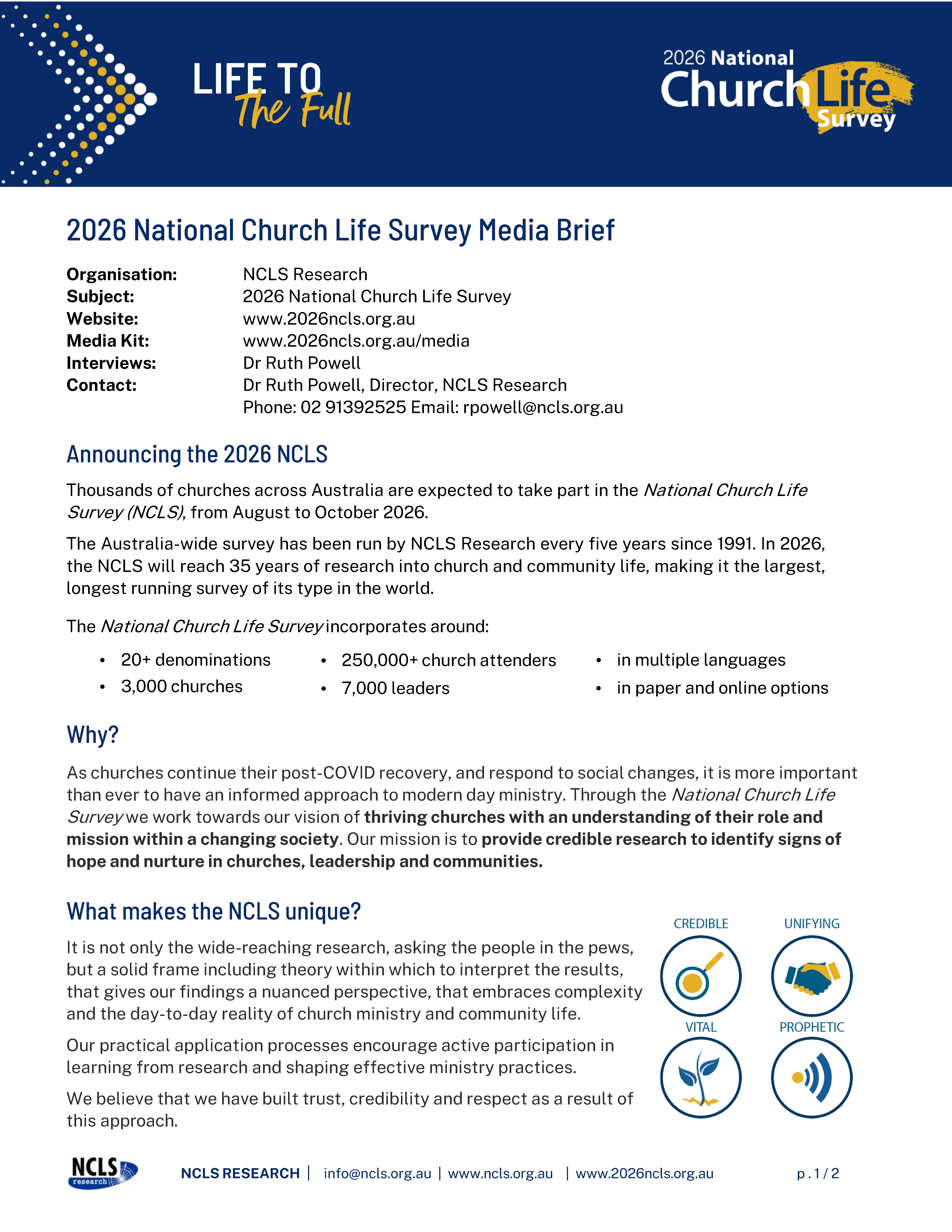 Interviews: Contact Dr Ruth Powell, NCLS Research P: 02 9139 2525 E: rpowell@ncls.org.au