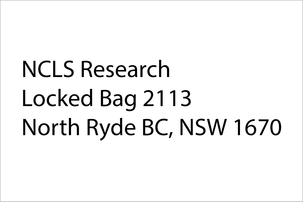 Stick the return address label over the original postpack that your surveys arrived in, to mail your completed survey items to NCLS Research at Locked Bag 2113, North Ryde BC, NSW 1670.