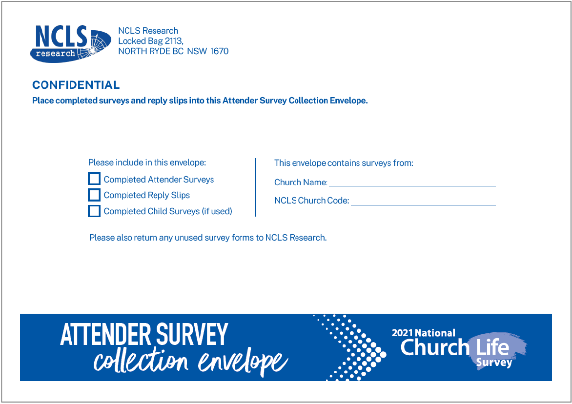 Inside the envelope, place completed Attender Surveys, Child Surveys (if completed) and Reply Slips. Approx 50 surveys per envelope. Please seal the envelopes and do not read attender responses, to protect attenders' anonymity.