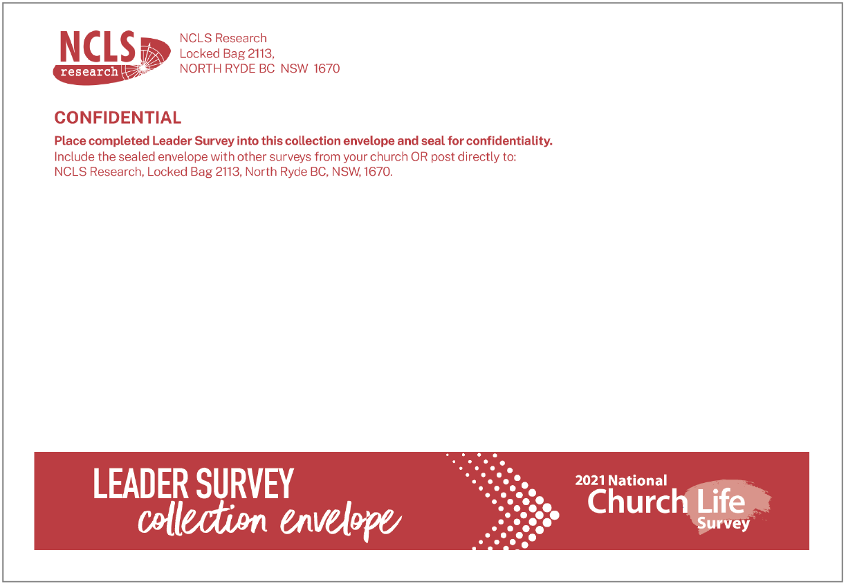 Leaders can return their completed survey, sealed inside the collection envelope, to their church survey coordinator or post it directly to NCLS Research.