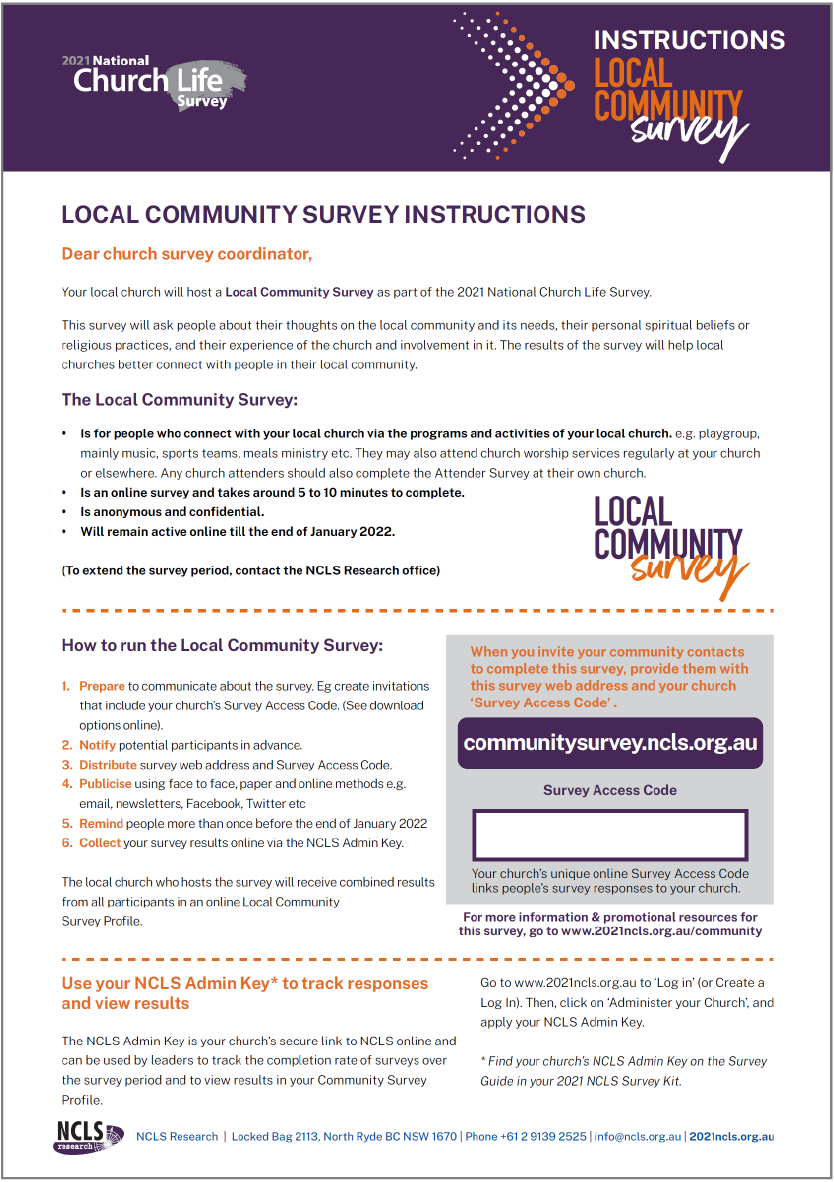Online only: The Local Community Survey can be completed online at communitysurvey.ncls.org.au