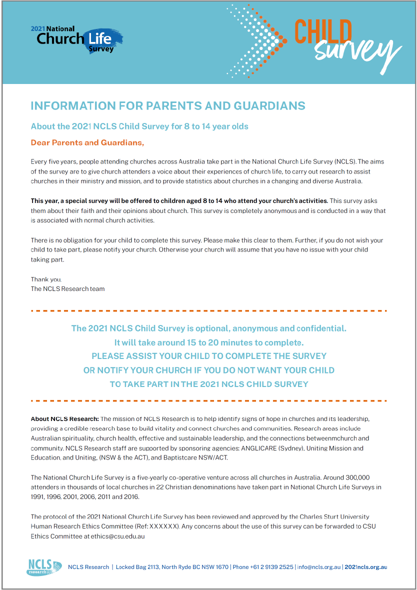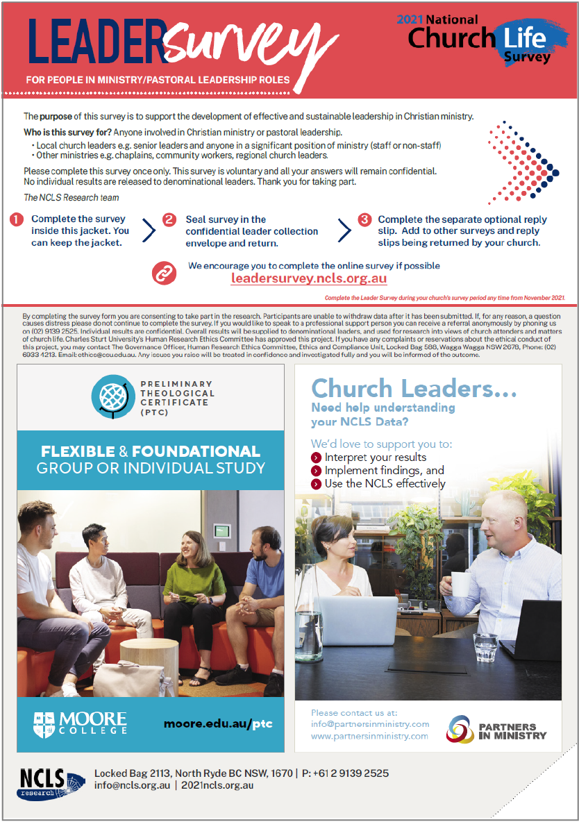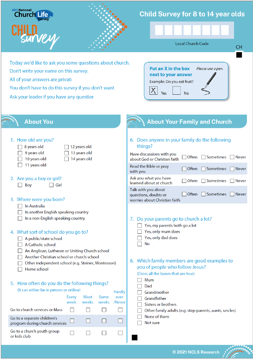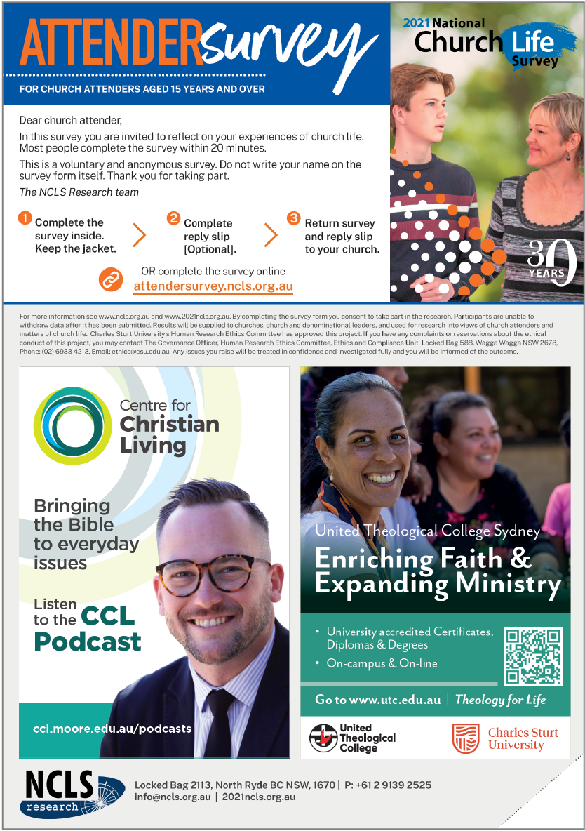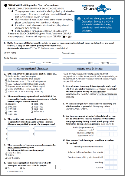 Online option: The Church Census Survey can be completed on a paper survey form, or online at churchcensus.ncls.org.au