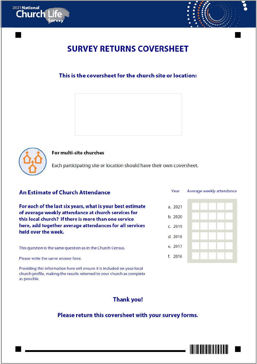 N.B. Multi-site churches or parishes should complete one Coversheet for each participating site or location and include with their batch of completed surveys on return (see page 3 of Guide for more details).