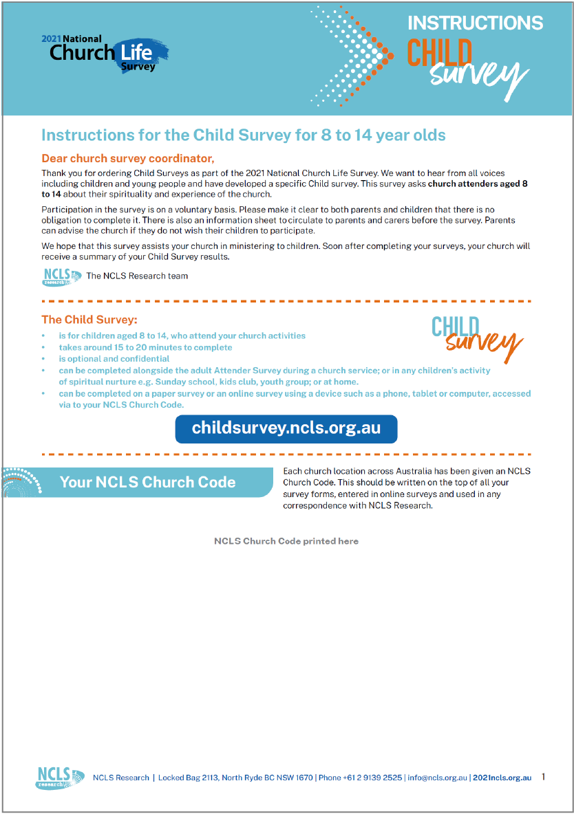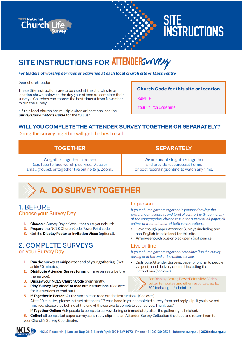 N.B. Multi-site churches or parishes will receive one Site Instructions/ Mass Centre Instructions Sheet for each church location or mass centre, displaying their NCLS Church Code (see Guide for more details).